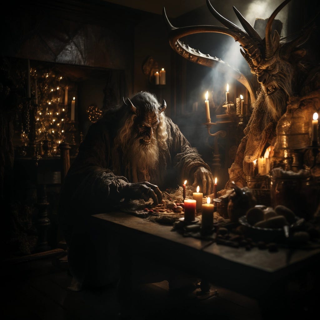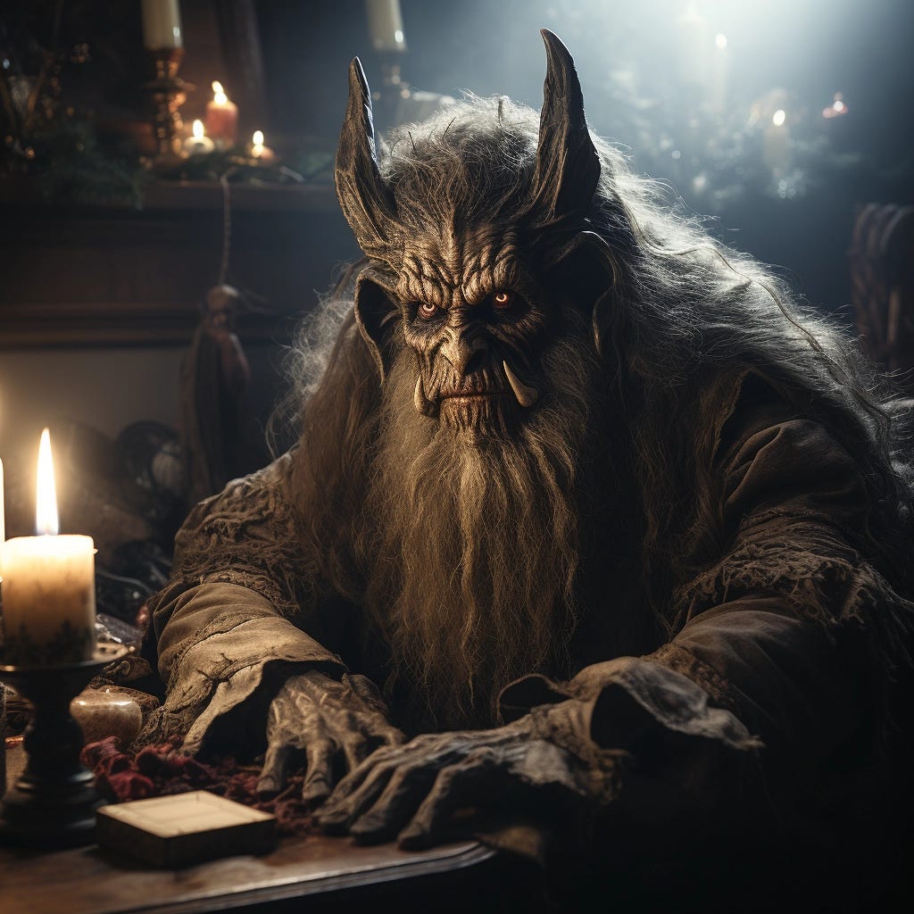 The creature that was Krampus smiled, his mouth a river of great crooked fangs, his long, forked tongue writhing behind them. Black eyes searched the faces of those closest, the glare from behind the ridged brows pushing the lesser creatures back with delicious terror. Lord Krampus, satisfied he had the attention of every fiend seeking to grovel at his lady’s feet, drew himself up to his full height, his great horns threatening the oil-filled sconces that hung from the ceiling. He straightened his blood-red robe with one six-fingered hand and yanked on the ruined end of a rusty chain.